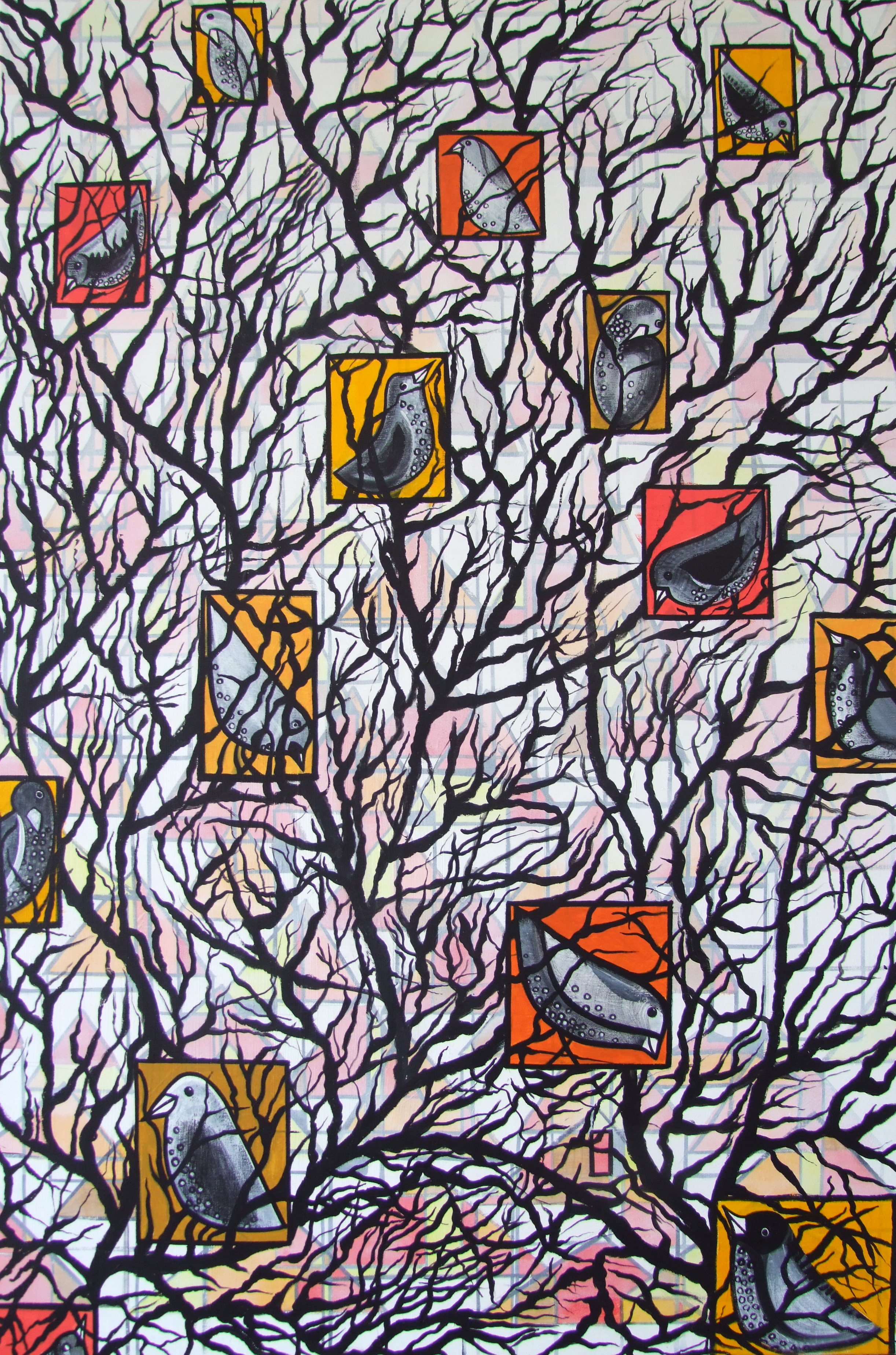 vogels in een boom, zoals ik ze zie vanuit mijn raam.