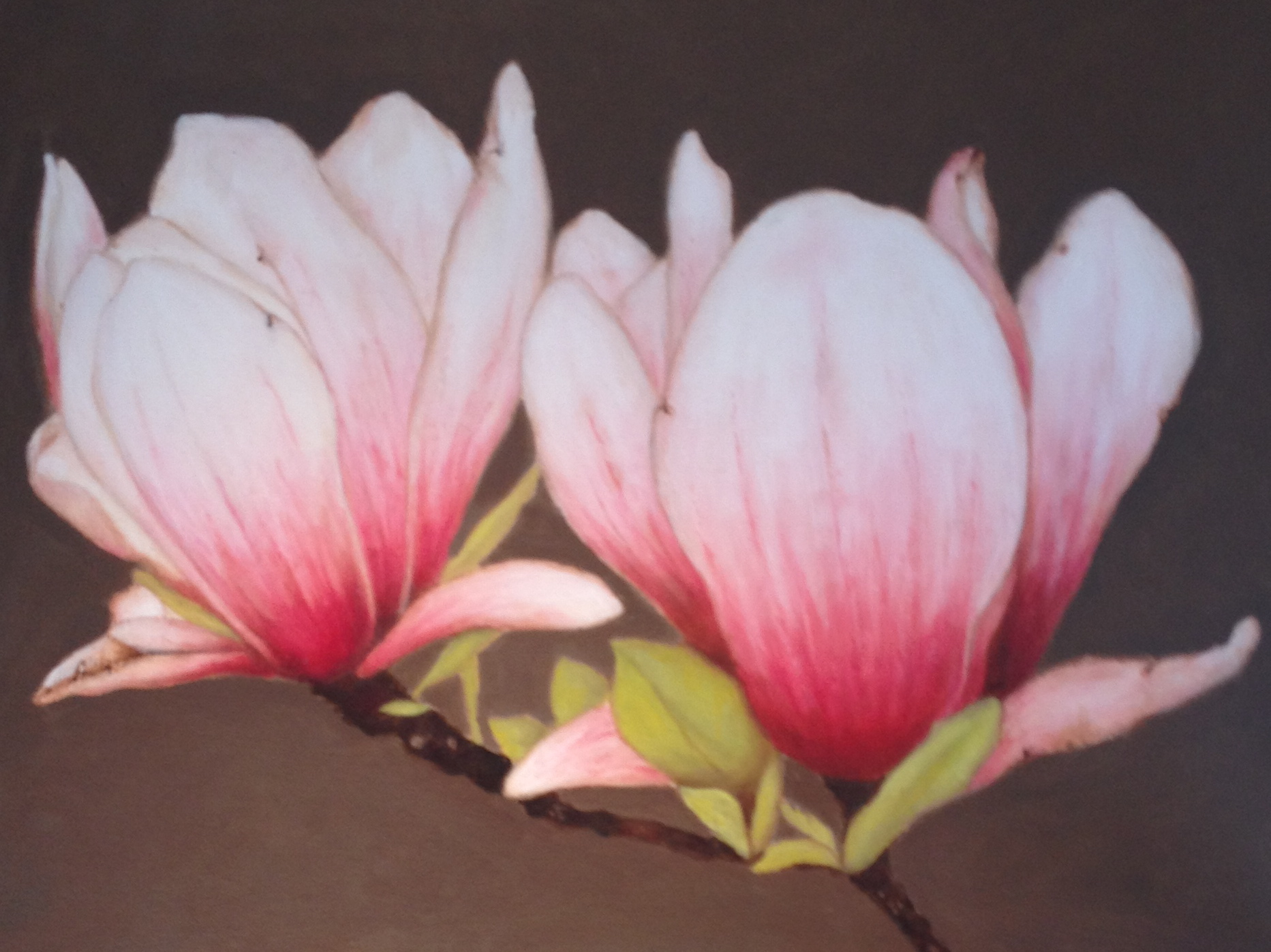 Twee magnolia bloemen, olieverf, incl zwartelijst