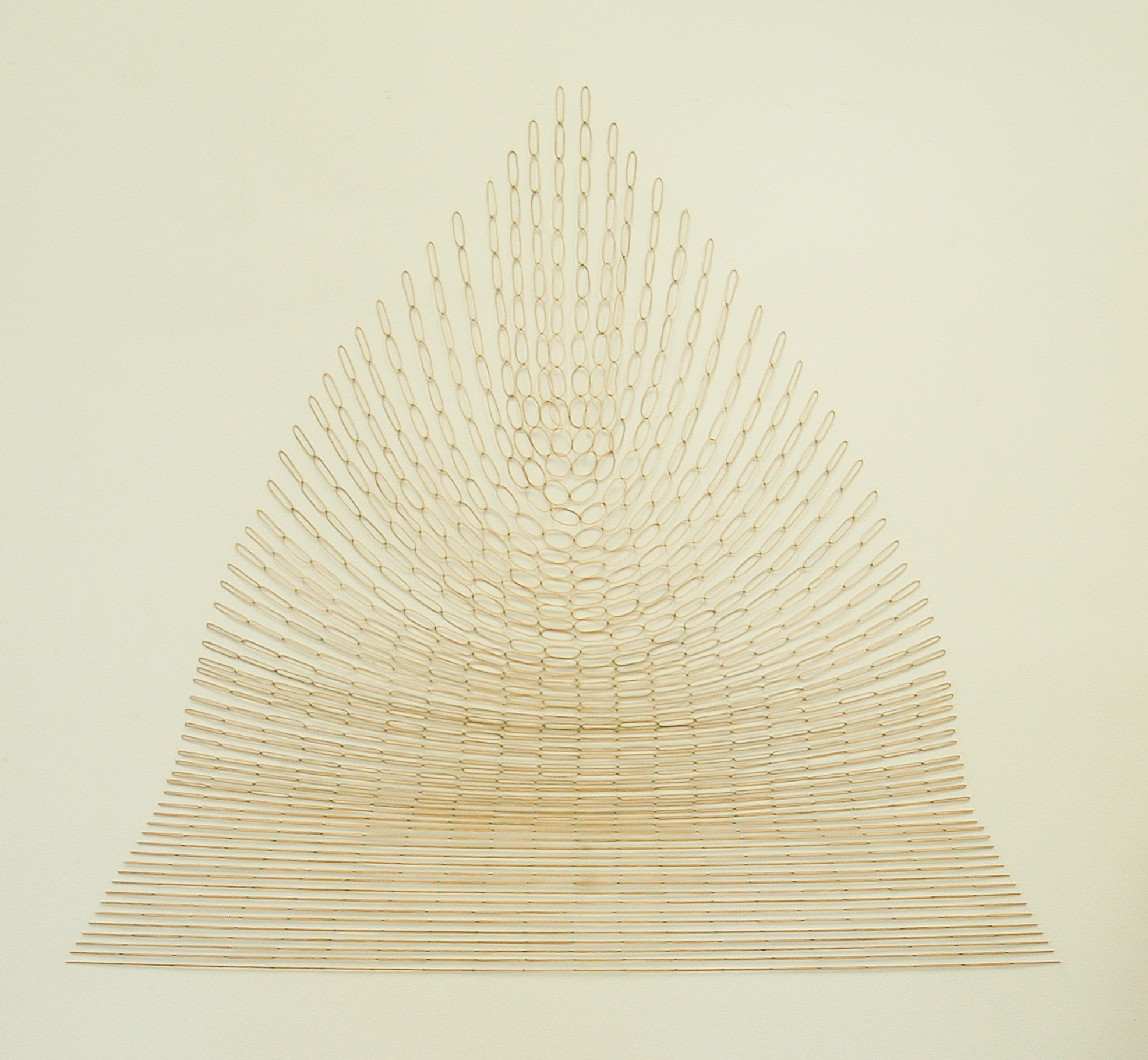 Twintig verbonden elastiekjes op tweeenvijftig verschillende manieren opgehangen. Materiaal: elastiekjes, stalen ringetjes.
