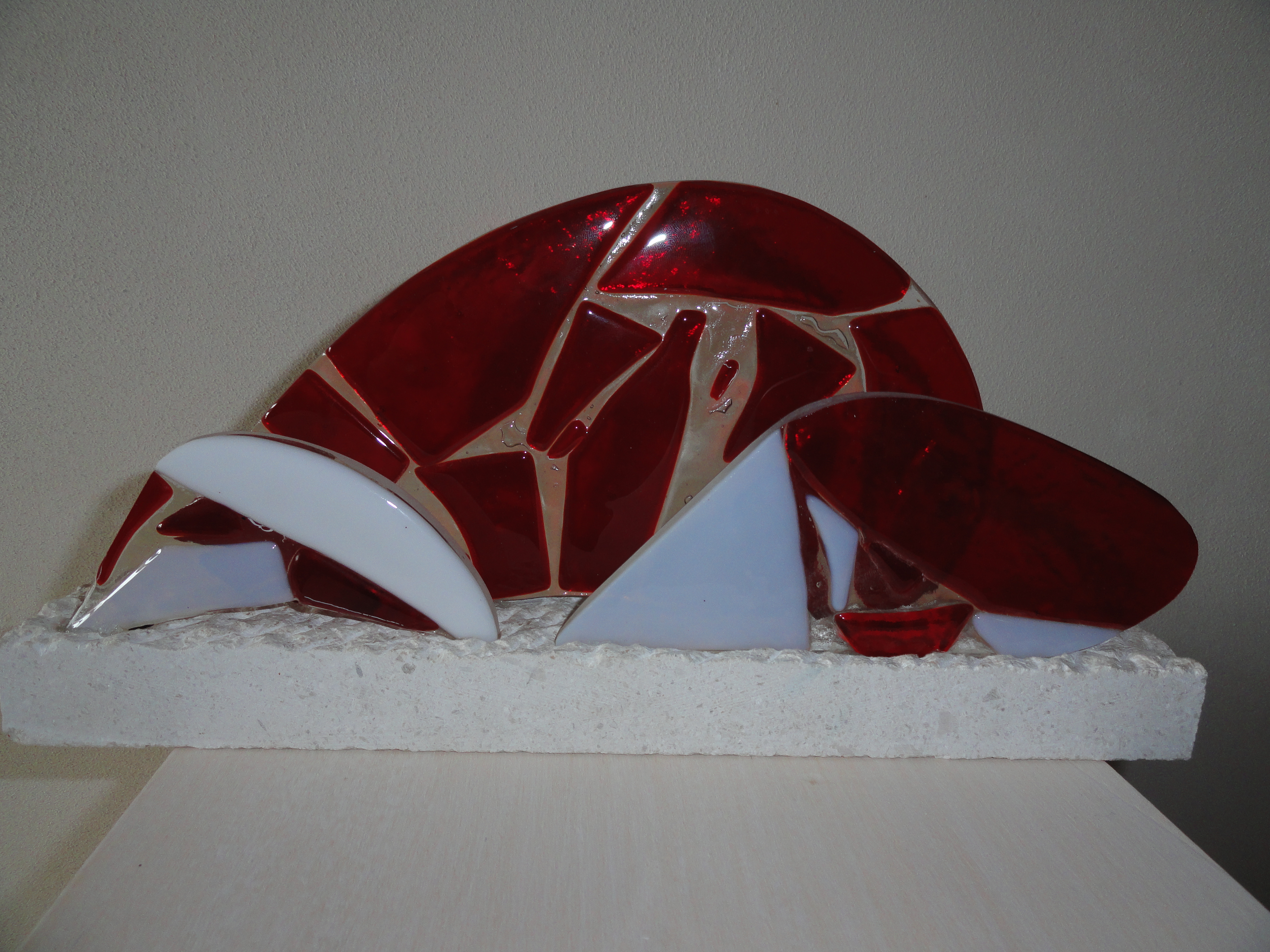 drie kleine autotjes van rood gefused glas op een blanco glasplaat. De autotjes zijn op een witte kalksteen geplaatst die aan de bovenkaant bewerkt is.