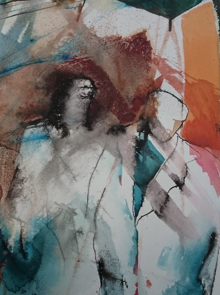 Een kleine aquarel met inkt en vetkrijt. je ziet een geabstraheerde figuur met daarachter nog een figuur. 3d Lijst zie informatiepagina kunstkado