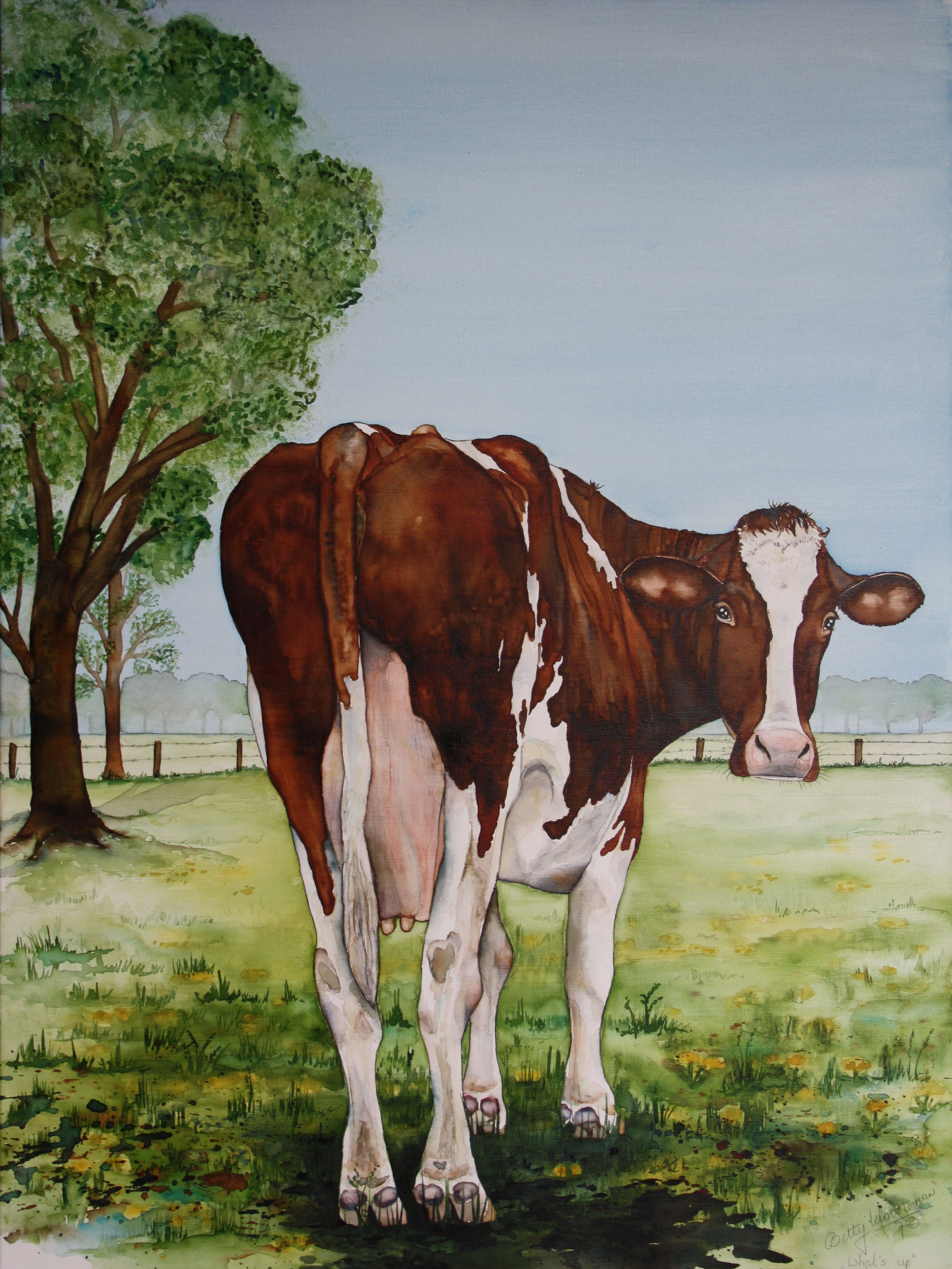 What's up? Portret van een roodbonte koe nieuwsgierig omkijkend, je hoort haar denken ...kijk je naar mij?. Aquarel door een speciale techniek op doek geschilderd.