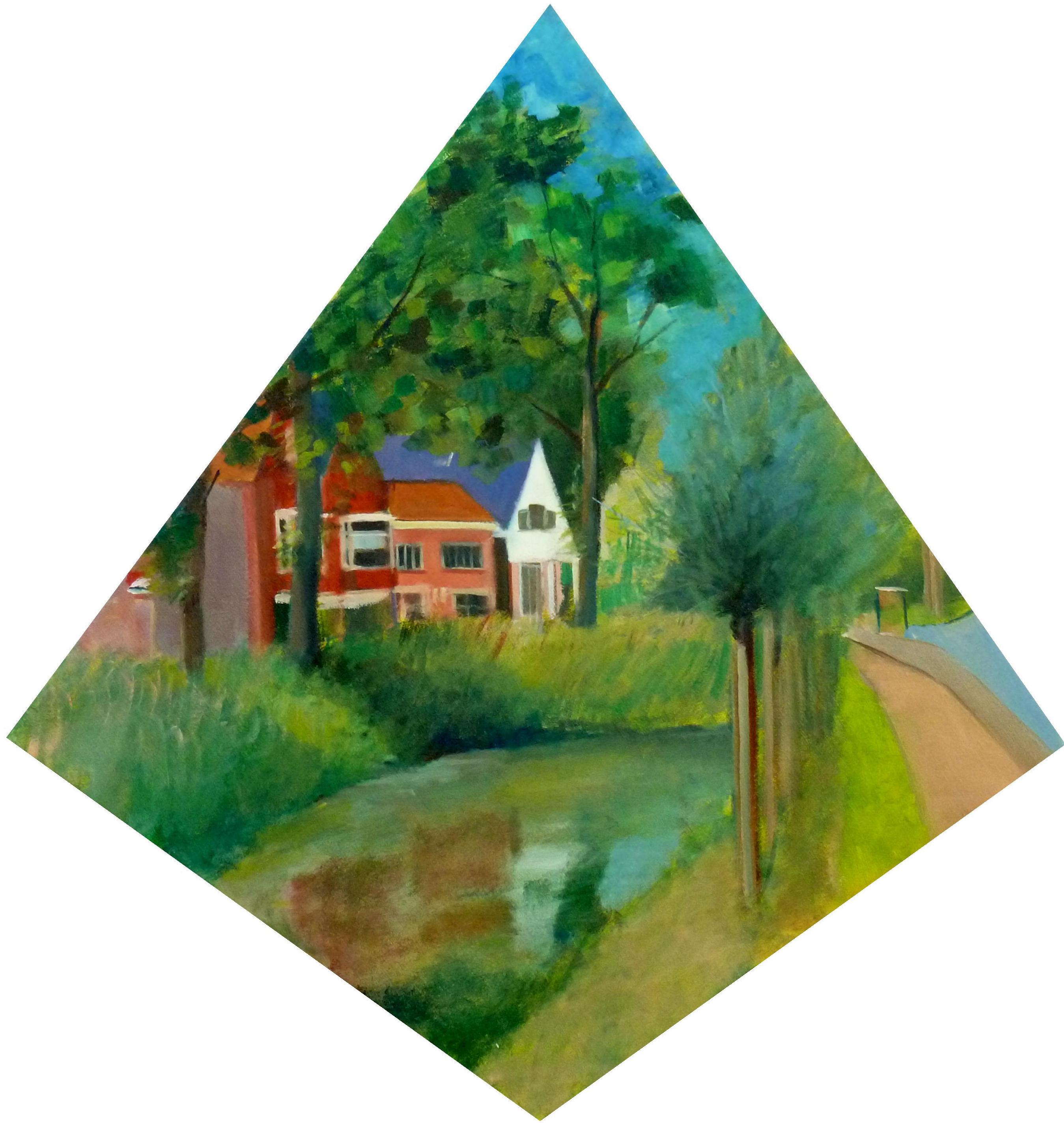 Oudorperdijkje te Alkmaar vanaf fietspad langs de Nieuwe Schermerweg op Hoekse Drup in olieverf op linnen