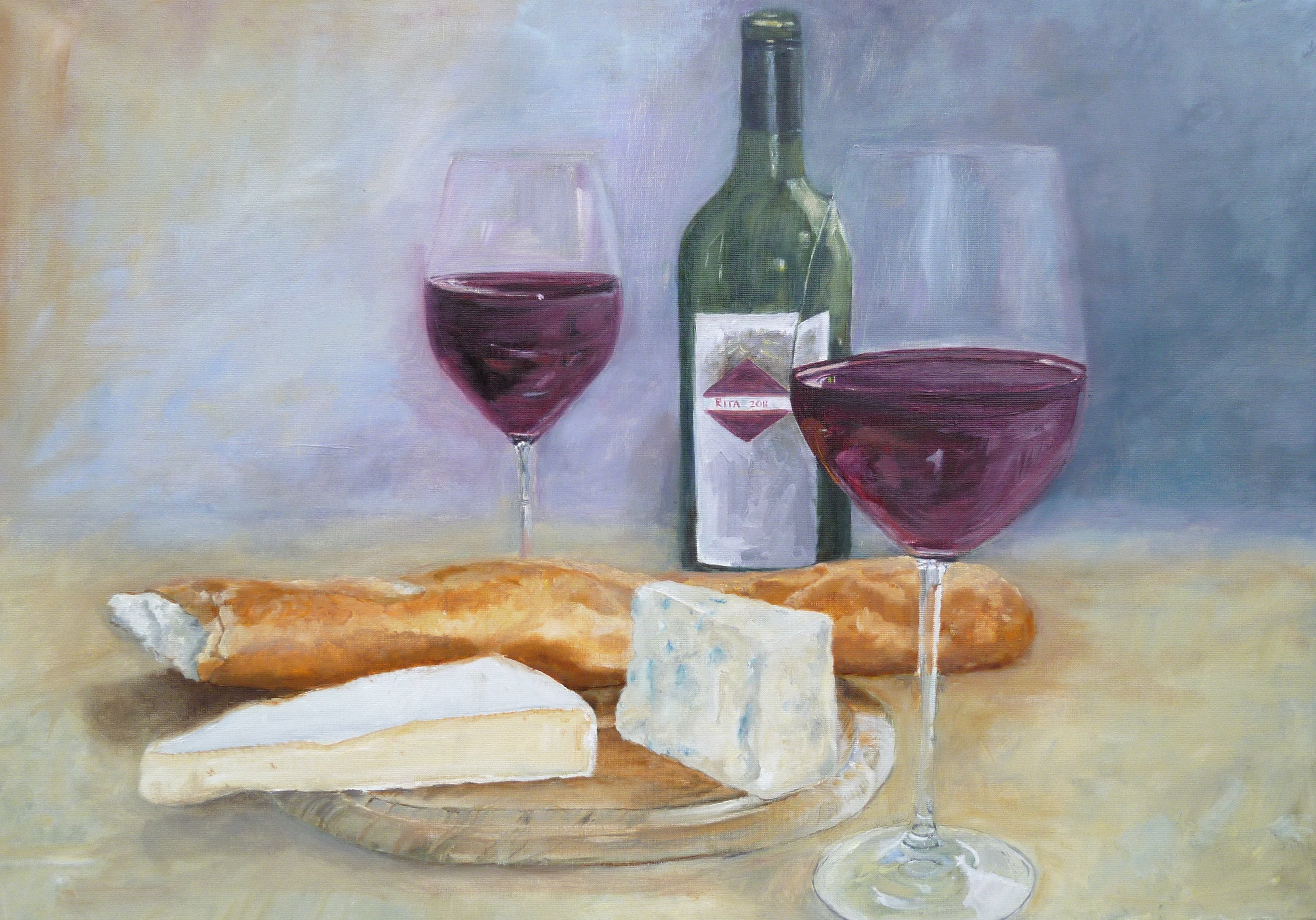 Fles Rode Wijn Stokbrood Brie Danisch Blue Kaas 2 Glazen Stilleven Realistisch Grijzen Rood Paars Blauw Oker Sienna