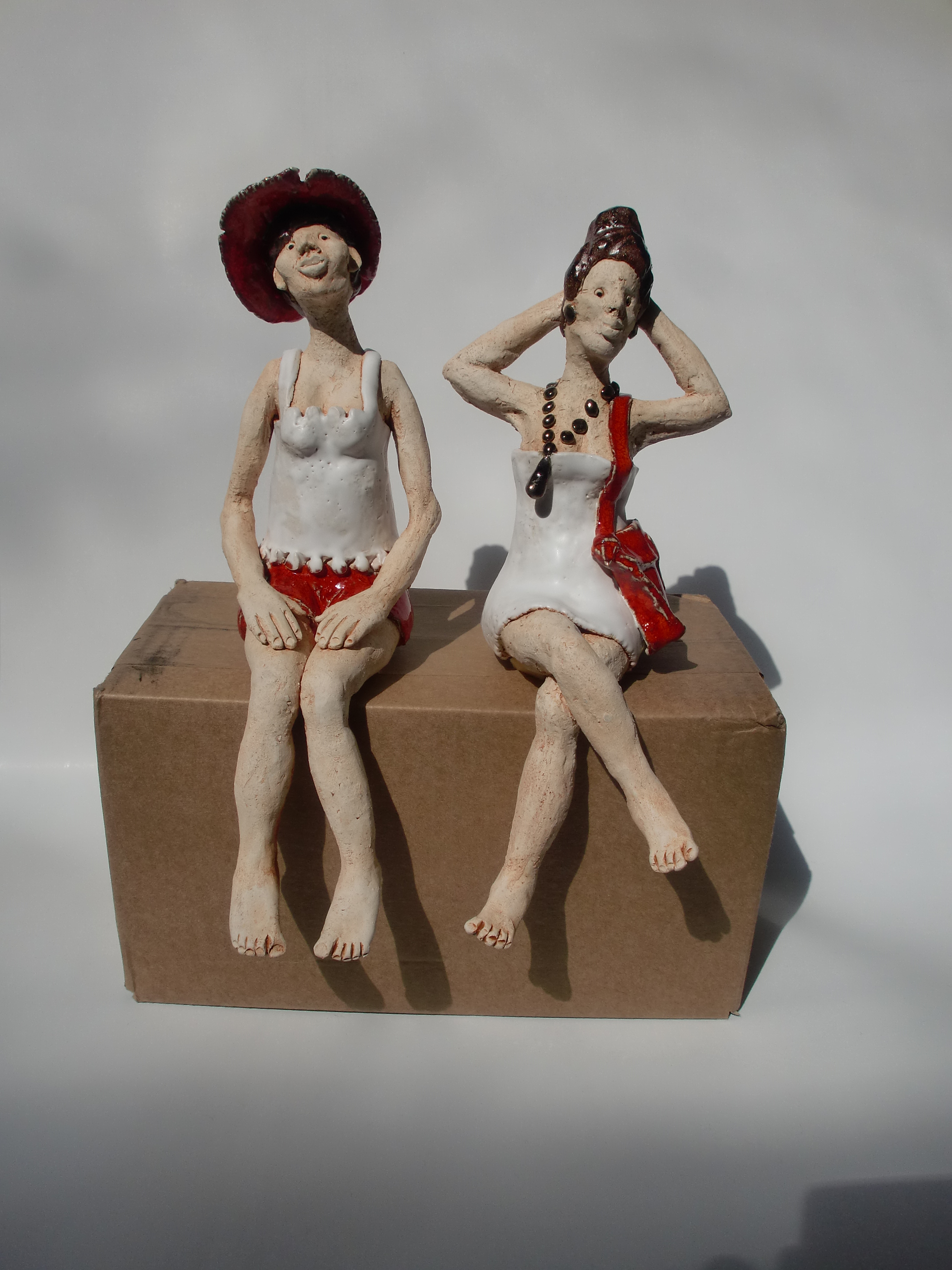 Dames lekker genietend van de zon. Keramiek afgewerkt met matte en glanzende glazuur.
