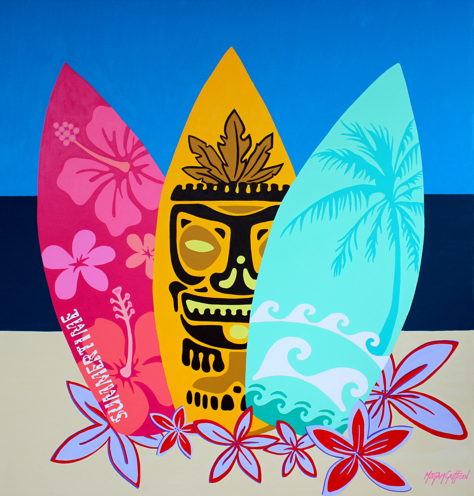 Surfplanken op het strand. Surfen is een oorspronkelijke vorm van boardsport. Sporten als wingboarden, windsurfen, kitesurfen en wakeboarden, maar ook skateboarden en snowboarden zijn hieruit ontstaan, De surfplanken zijn vaak mooie kunststukjes zoals deze met een tiki en hawaiibloemen.