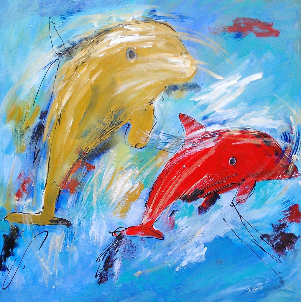 Dolfijnen Dieren Vissen Vis Water Kleur Kleurig Vrolijk Modern Acryl Doek