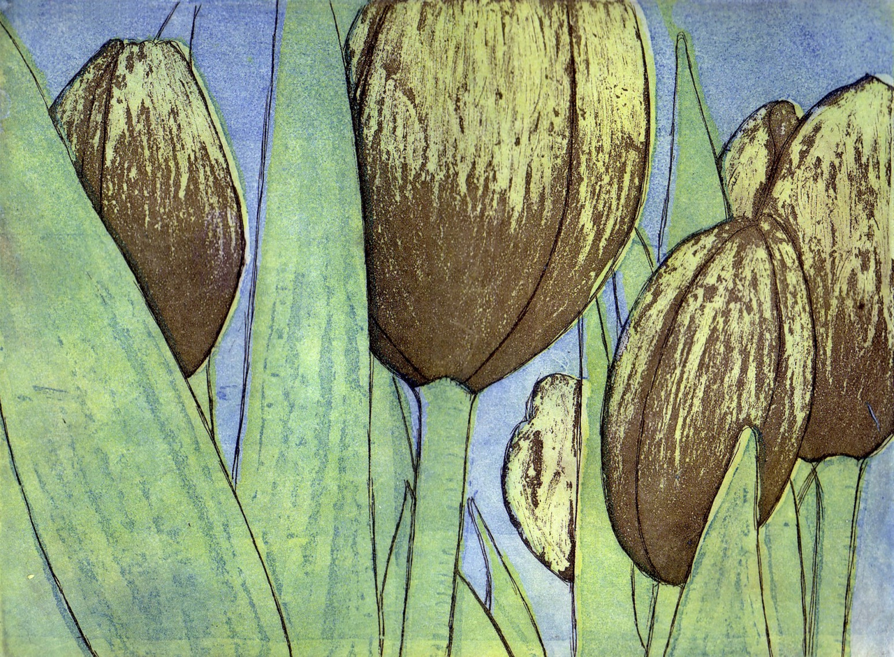 Driekleurendruk door gebruik van 3 verschillende etsplaten.