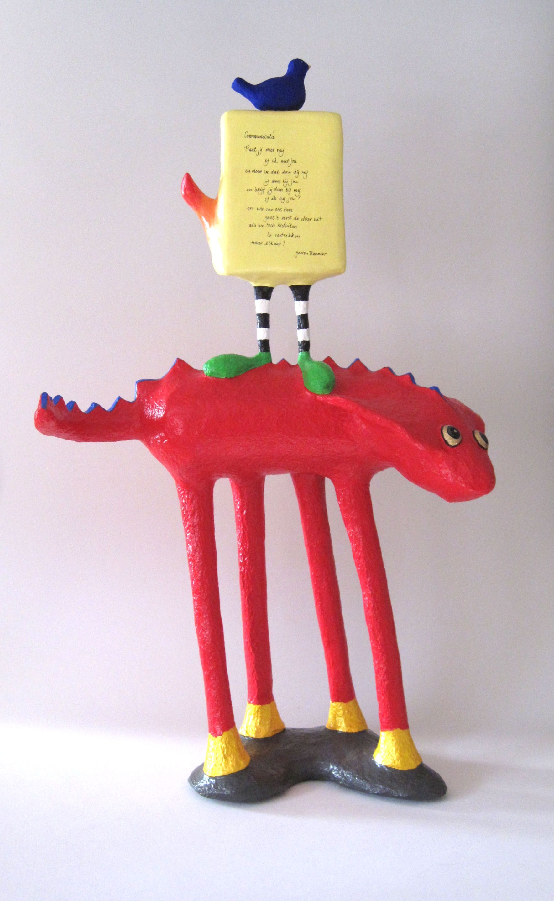 Draakachtige Hond met stapeling van Doosachtig Mannetje met CD en een Vogeltje. Het Mannetje is voorzien van een Gedicht van Gaston Bannier.