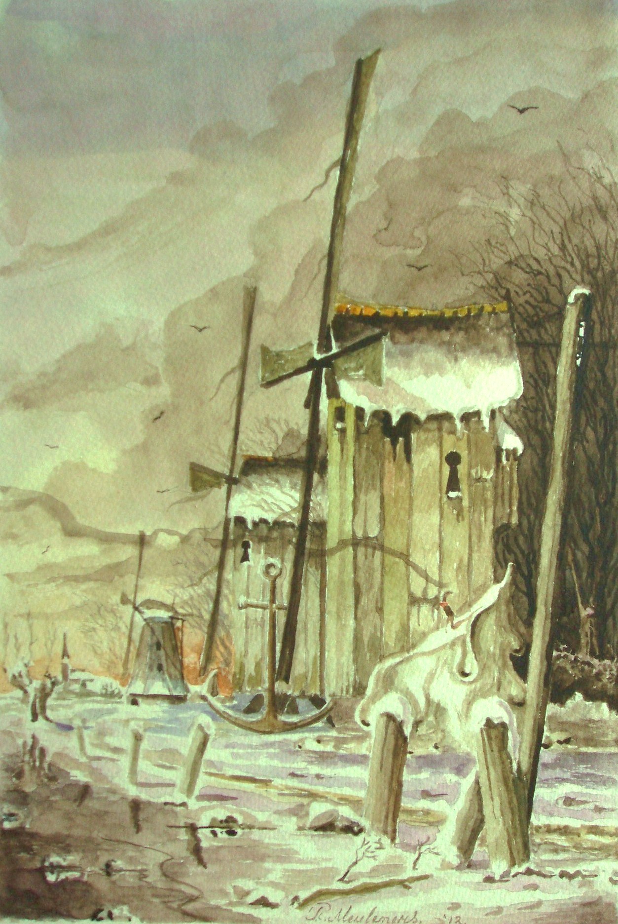 Landschap Romantiek Aquarel Winter Surrealisme Realisme Fantasie Anker Kaars Molens Kerst Kaart