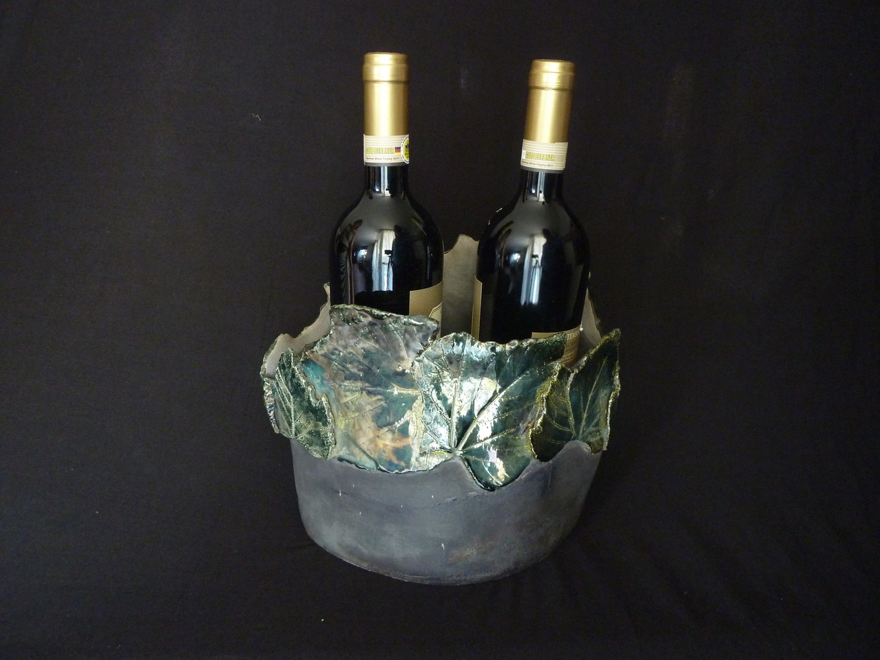 Raku gestookte wijnkoeler zwart met groene druivenbladeren geschikt voor 2 wijn flessen.