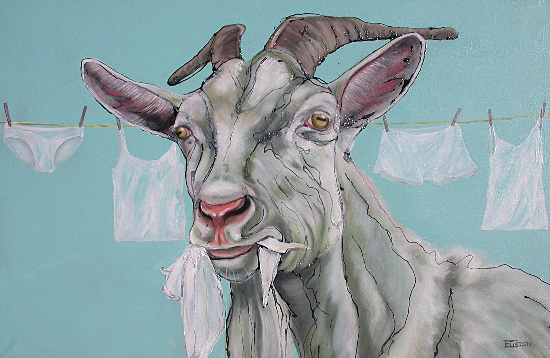Schilderij Wit Blauw Blue Painting White Geit Goat Was Erlinde Ufkes Stephanus Animalart Dierenkunst Dierenschilderijen Animalpaintings Laundry Geitenschilderij Goatpainting