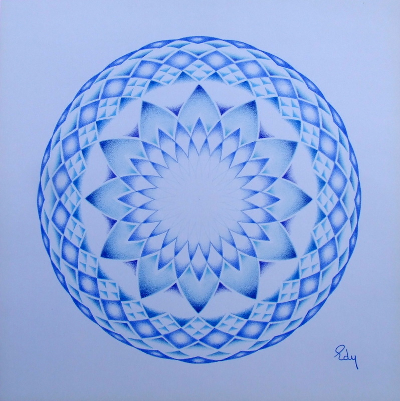 Edy combineert haar liefde voor kleuren en papier door blanco tekenvellen te vullen met in elkaar overvloeiende kleuren en mooie vormen. Vaak is een mandala de basis.