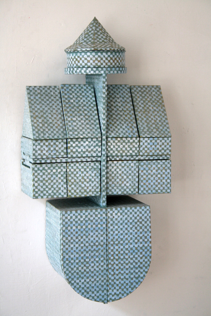 uit losse en uitneembare elementen samengesteld wandobject. hout papier,olieverf.