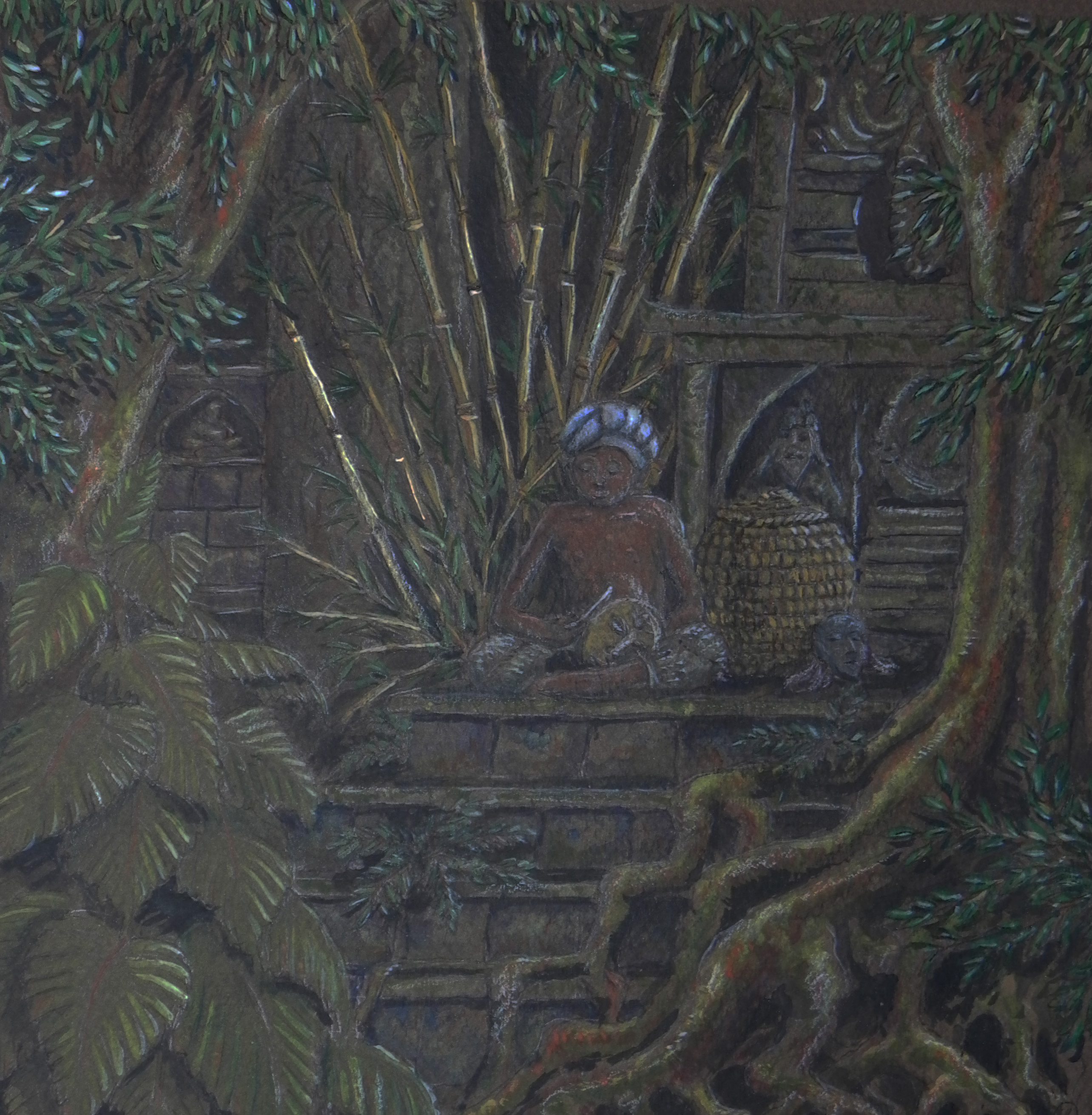 Het sprookje over een maskermaker inspireerde me tot dit werkje. In een oude tempel, snijdt de maskermaker aan zijn werk. De maten zijn inclusief lijst.