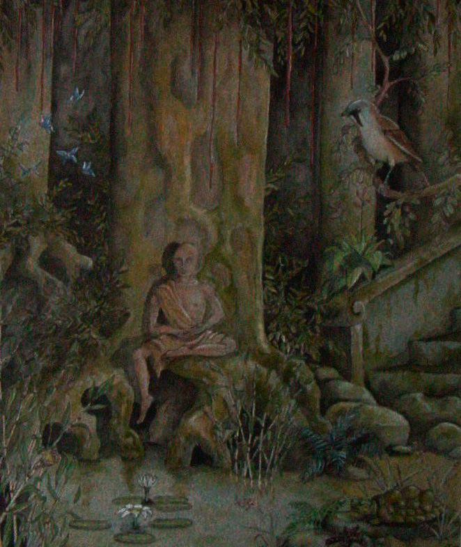 Een priester mediteert bij een vijver onder een grote boom. Niets verstoort de rust.