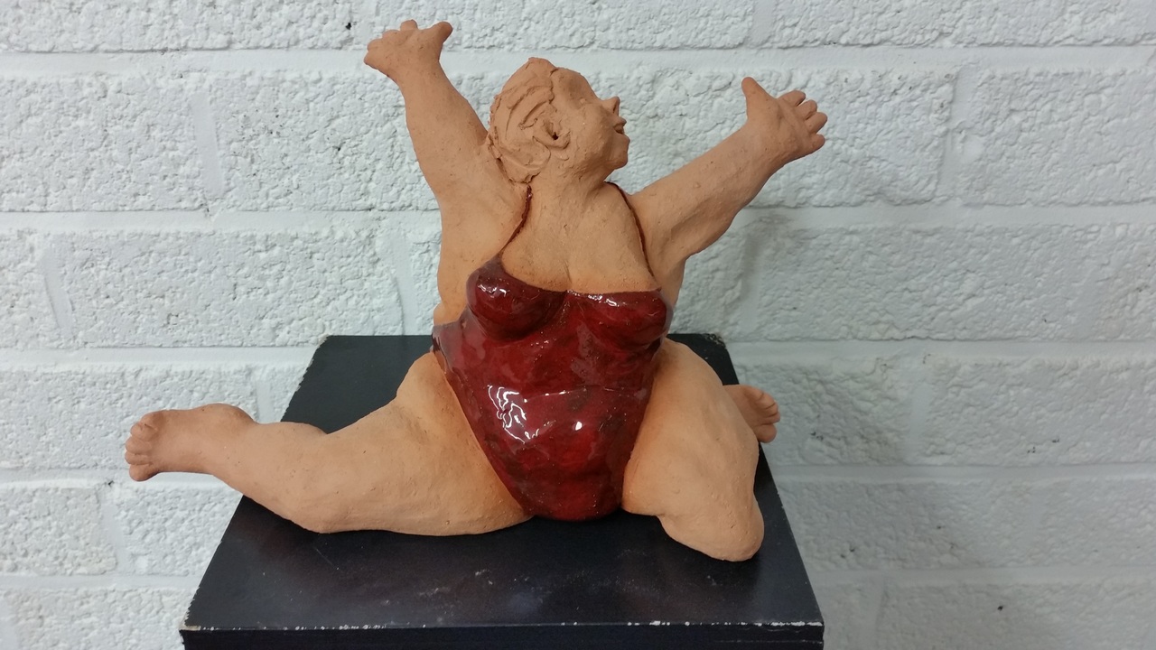 Dikke vrouw van keramiek afgewerkt met rood glanzende glazuur