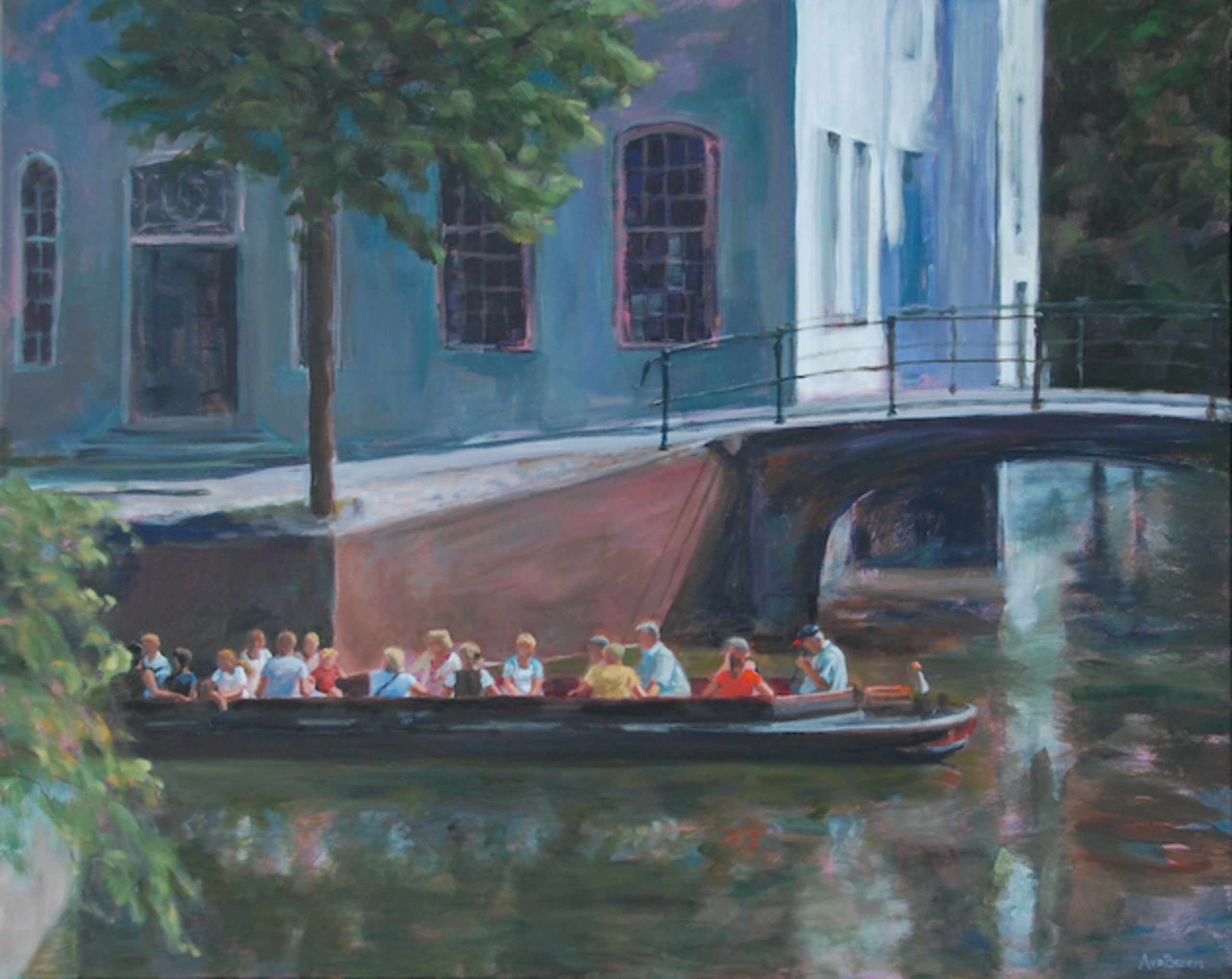 Rondvaarttocht door de Amersfoortse grachten, voor het huis met de paarse ruitjes.