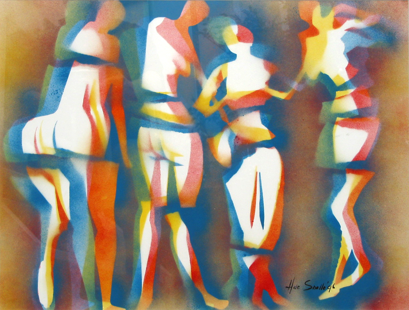 Kleurrijke dames op papier achter glas