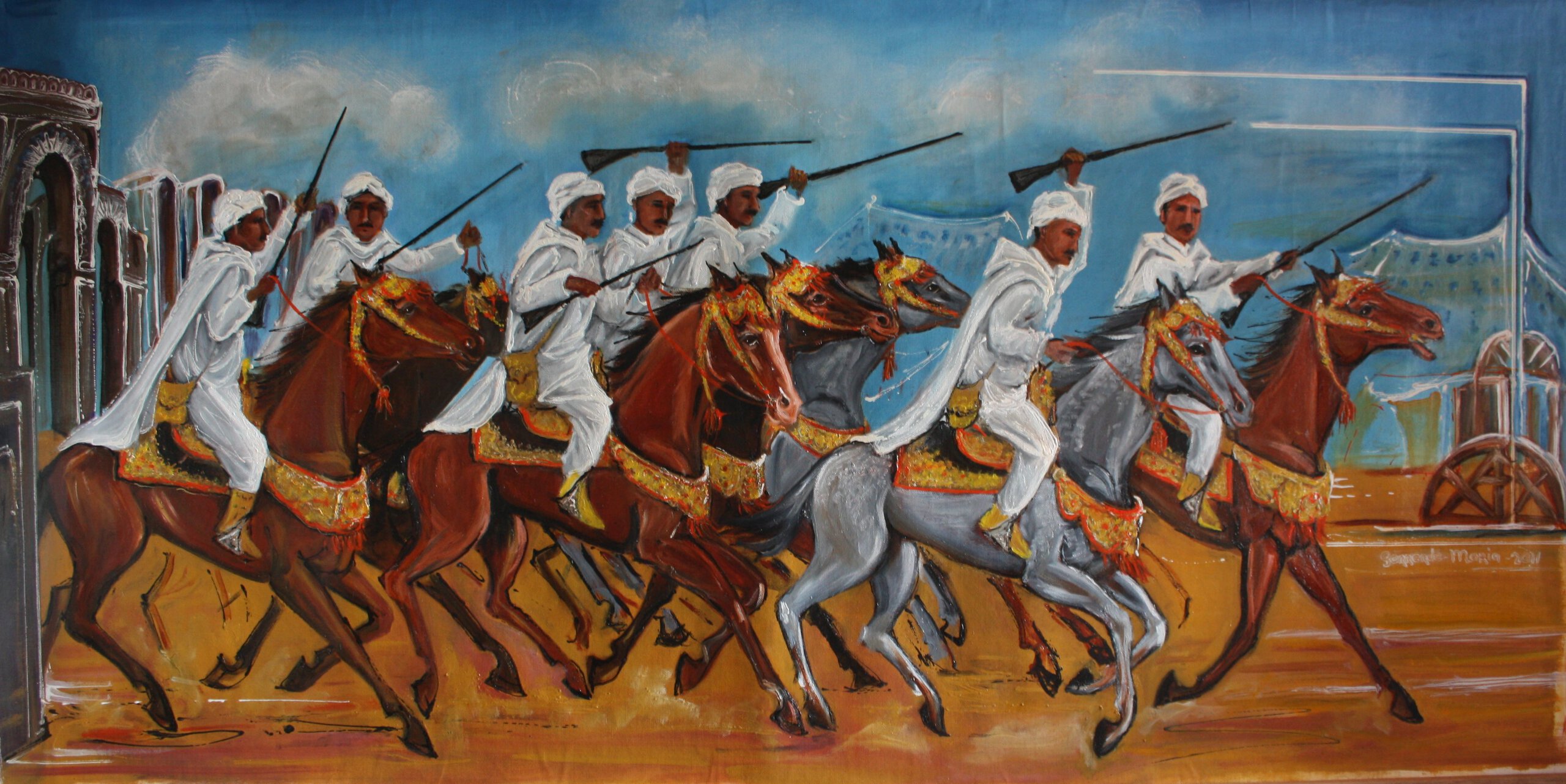 Marokkaanse paarden race, waarbij de ruiters, op hun prachtig versierde paarden,allerlei capriolen uithalen met hun geweer tijdens die race en dan tegelijkeretijd hun (kruit-)geweer afschieten aan het eind van het parcours. Het paard staat dan gelijk stil.