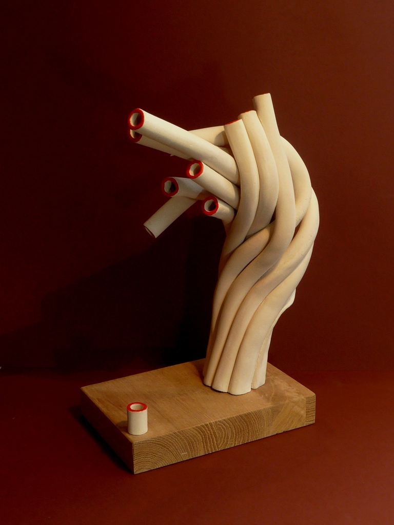 Relatie tussen cultuur en natuur. In mijn werk als beeldend kunstenaar onderzoek ik de relatie tussen natuur en cultuur. Onze gecultiveerde wereld symboliseer ik met kubus en rechthoek vormen. Deze zet ik in contrast met het grillige en chaotische van de natuur. Is er een winnaar? Waar zit de strijd? Waar ontstaat er harmonie? met klei verbeeld ik dit in 3-d objecten. Ook combineer ik klei vaak met andere materialen zoals hout en ijzer. Hanneke Windhausen