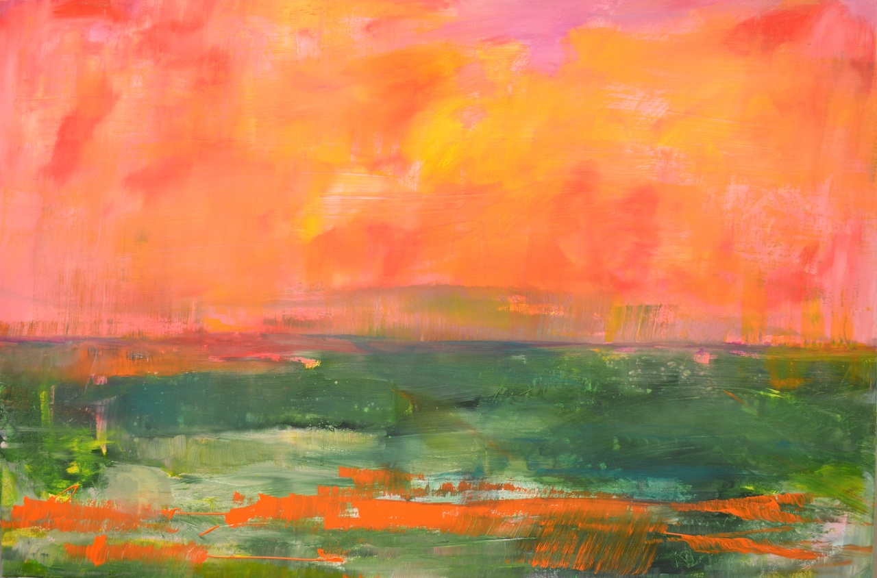 Acryl schilderij van de polder achter mijn huis. Het water wat op het land staat verkleurd mee, net als de lucht nu de zon onder gaat.Het zorgt voor onwerkelijke kleuren tussen de klei op de grond.