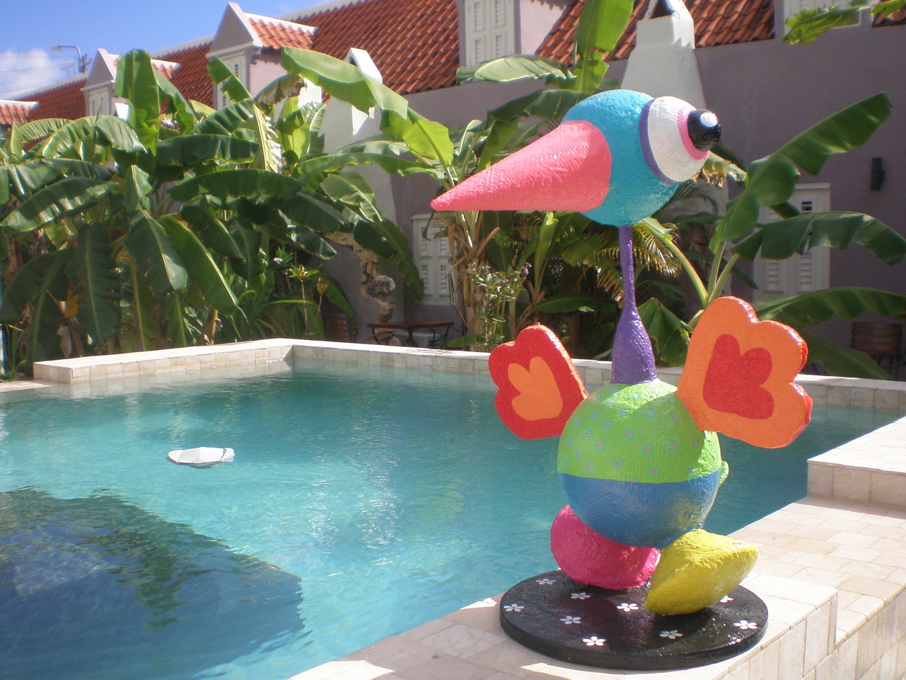 Vreemde vogels zijn overal, deze bijvoorbeeld bij het zwembad in het gezellige Pietermaaidistrict in Curacao, De vogels zijn gemaakt van recycled materiaal, zijn voetjes zijn oude koplampen van een auto en zijn nek is een kunsstof champagneglas geweest etc etc. de materialen heb ik ingepakt met glasvezels en polyester zo ontstaan mijn vogels. Zo wordt afval kunst en beelden voor buiten in de tuin.