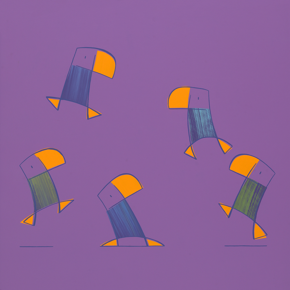Paars schilderij met daarop vijf Duikertjes. Hun jasjes bestaan uit brede kwaststreken die later met een iets lichtere paarse laag zijn ingesloten zodat de jasjes zijn ontstaan. De snavels zijn oranje.