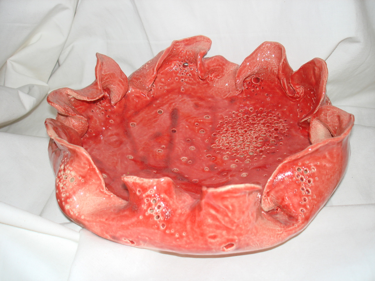 geplooide rode enigszins opengewerkte (op plaatsen rond doorboorde) schaal.