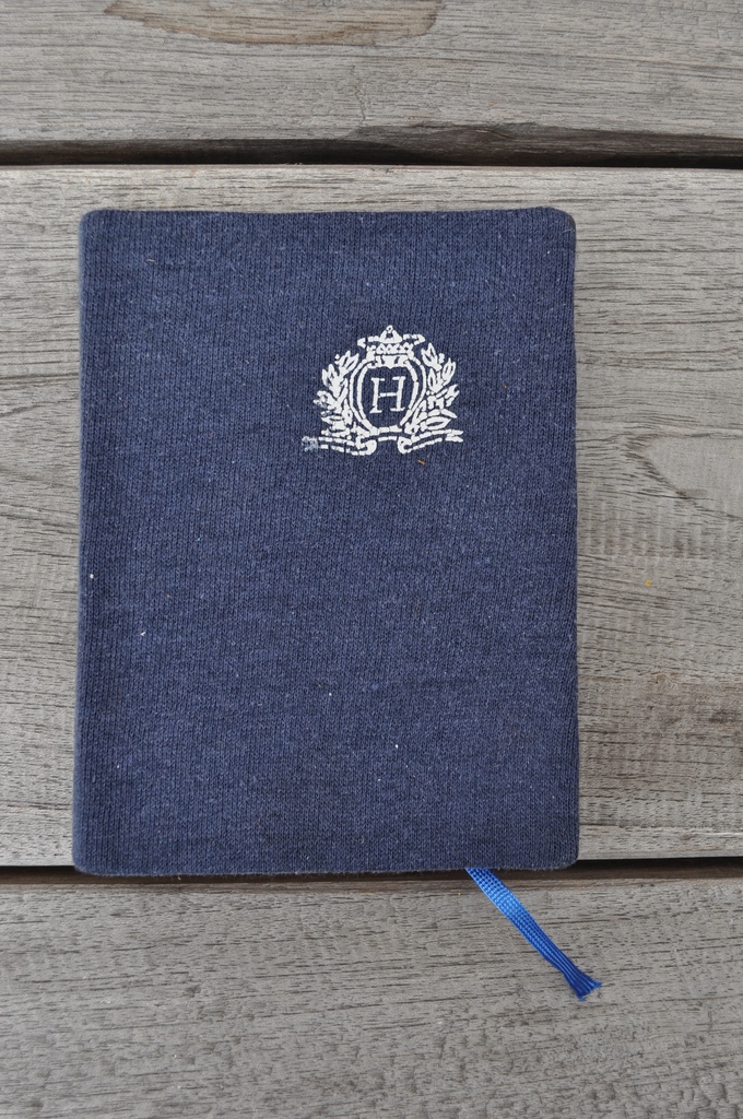 Handgebonden boek met afwisselend rose en geel zwaar papier. Gebonden met een deel van een sweatshirt.