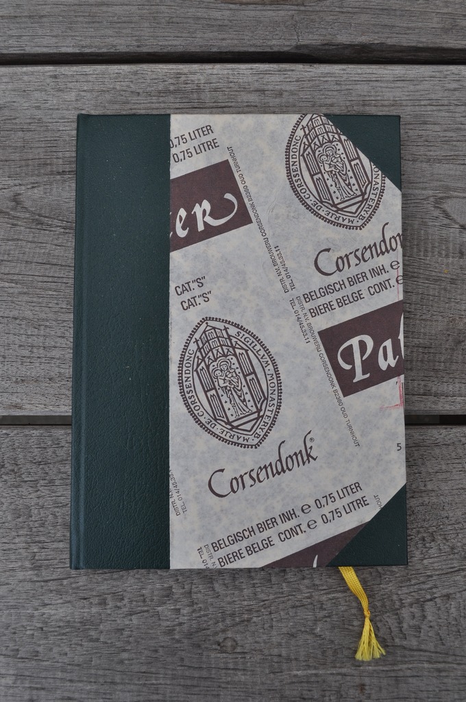 Handgebonden noteboek. Gebonden in kunstleer en verpakking van bierfles.