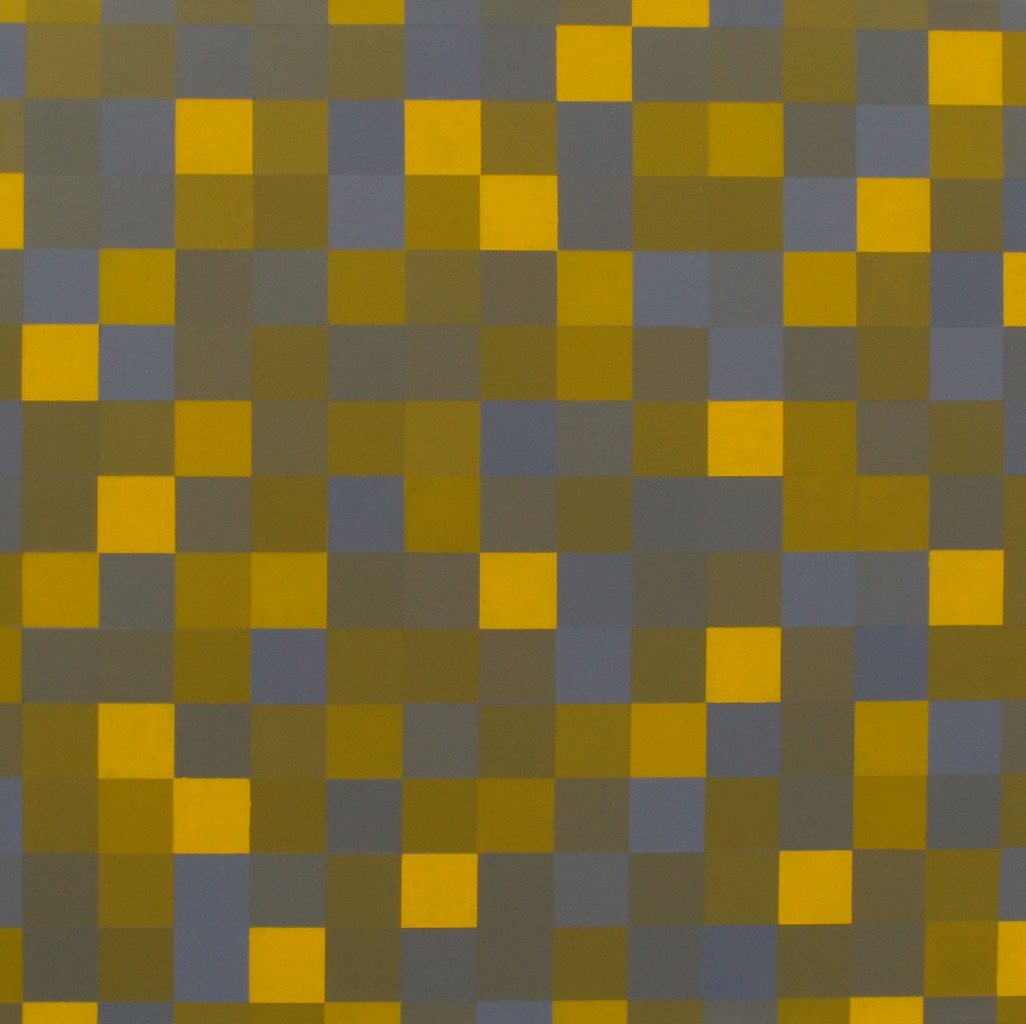 Derde van de bovenste reeks: grijs uit zwart en wit, gemengd met meer of minder geel
