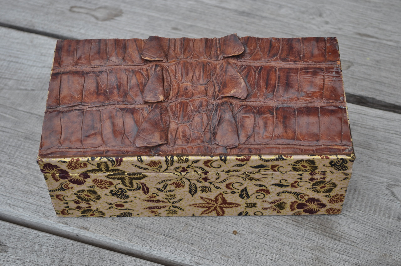 Doos met scharnierend deksel. Bekleed met bedrukt katoen. Afgewerkt met krokodillenleer. Afkomstig van een damestasje, dat de repatriering uit Nederlands Indie nog meemaakte.