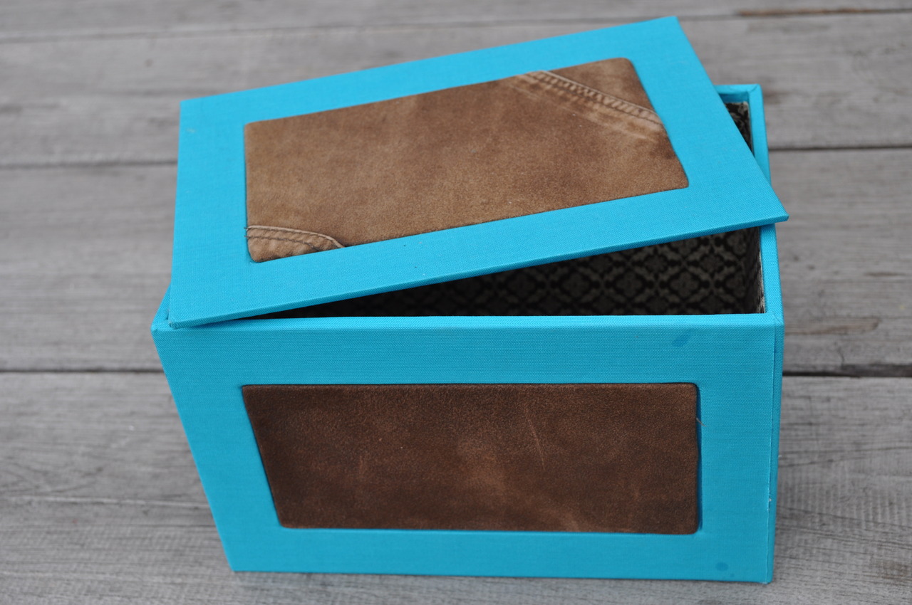 Doos met losse deksel. Bekleed met linnen waarin medaillons van leer.