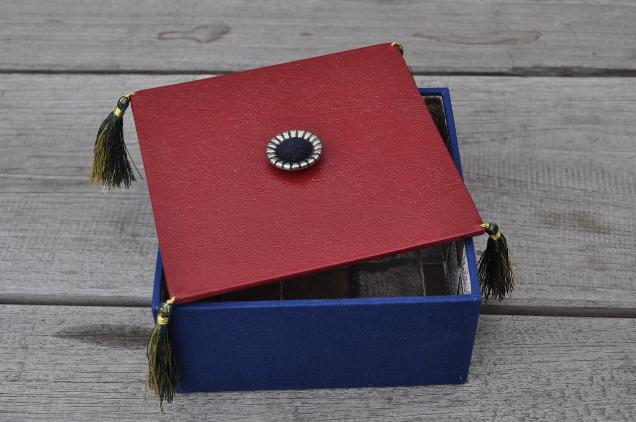 Doos met losse deksel. Bekleed met linnen en kunstleer. Knoop en flossen uit Turkije.