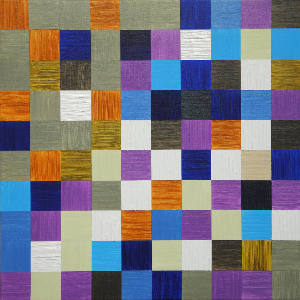 Thema: Chaos (Geometrische Chaos) Mijn kunst is beïnvloedt door de moderne wiskundige en wetenschappelijke benadering van het begrip complexe orde van de natuur. Met name heb ik me verdiept in de Chaos theorie en de fractal geometrie. Ik ben geen wiskundige, en ik gebruik geen wiskundige formules. De ideeën van de Chaos theorie en fractal geometrie leiden tot de ontwikkeling van de composities in mijn werk. Ik gebruik driehoeken,vierkanten en cirkels in mijn schilderijen, maar in mijn huidige serie, geoChao richt ik me alleen op de vierkanten en de verhoudingen tussen de vierkanten. Ik ontwikkel mijn composities door kleine vierkantjes op grote te zetten of grote op kleine te zetten. Het gaat om de onderlinge verhoudingen tussen de vierkanten. Ik laat de methode die ik kies de compositi