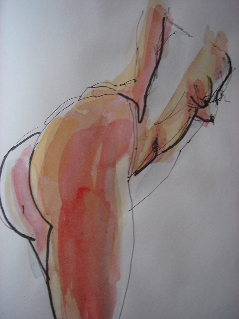 Vrouw torso en benen. getekend en geschilderd met inkt en auqarelverf op papier ca. 21x30 cm. Rood, oker, zwart, wit, etc.