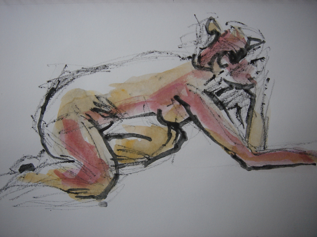 Vrouw op knie. Getekend en geschilderd met aquarelstift en aquarelverf op papier ca. 21x30 cm. zwart wit paars lila roze oker
