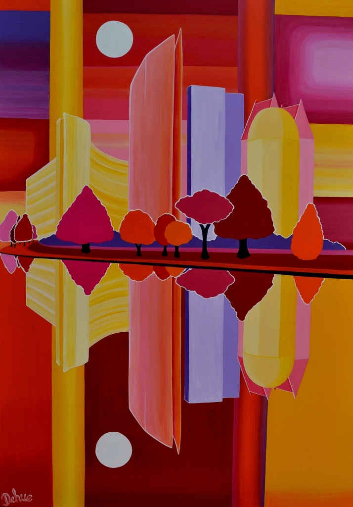 De skyline van mijn geboortestad Den Haag in rood, oranje, roze, geel, paars en wit met weerspiegeling in het water en verdeeld in kleurvlakken. Met o.a. de Hoftoren (De Vulpen), Castalia (Tieten van Den Haag) en de Zurichtoren (De Citruspers). Afgewerkt met een dubbele vernislaag. Inclusief certificaat van echtheid