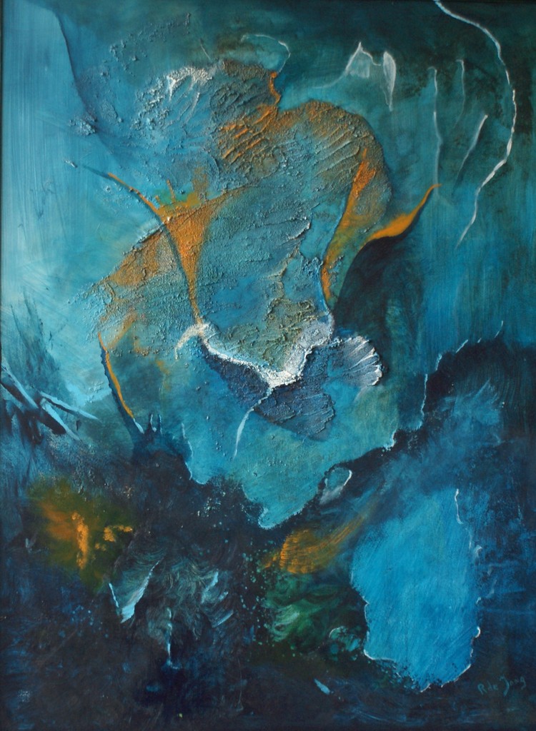 The world is waiting De wereld (kerk) wacht op de uitstorting van de Heilige Geest. Het koele blauw symboliseert de koele, zakelijk, harde samenleving . het onderste gedeelte verbeeld chaos en gebrokenheid Rechtsonder een groot gat , ledigheid . Rijp om gevuld te worden . Middenin schilderij een witte (duif ?) vogelachtige voorstelling , waarbij het wit uitloopt (uitstorting van de H.Geest .) Bovenin vurige , maar nog niet voltooide vlammen .