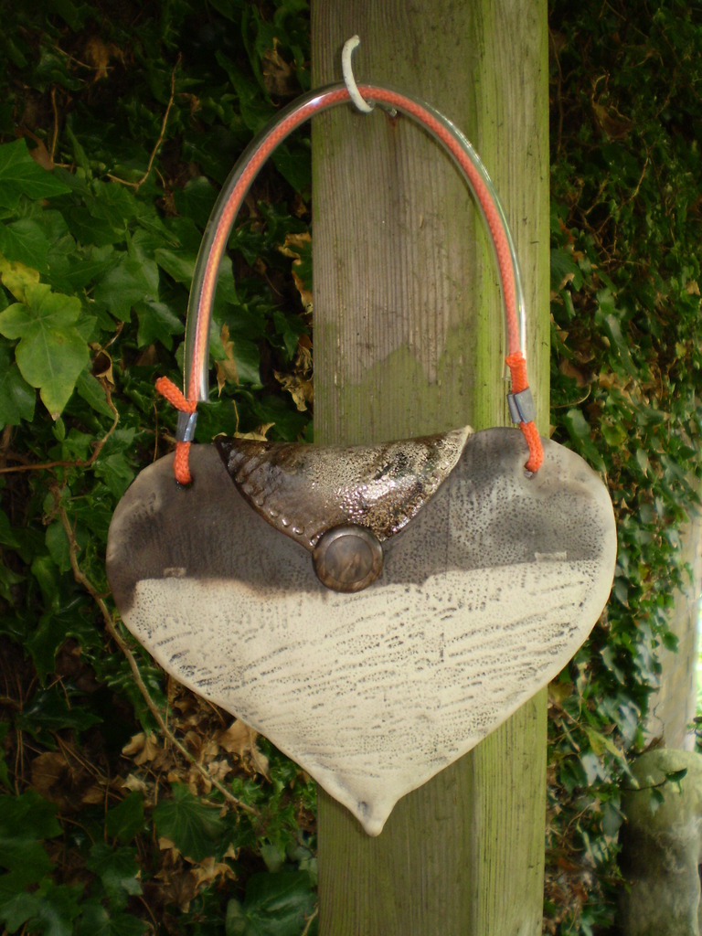 Van harte tas.....handvorm...rookstook en glazuur, plastic hengsel.