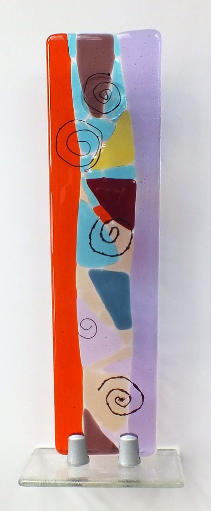 Glasobject op sokkel. Gemaakt van Bullseye glas met koper insluitingen.