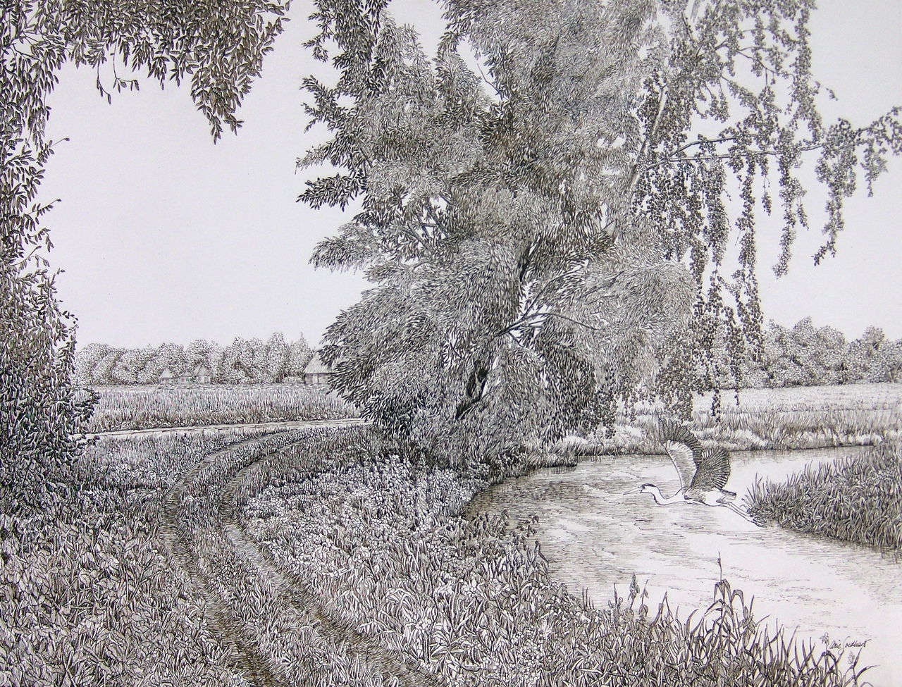 de reiger vliegt op,en zwenkt over de reest ,een beekje bij deWijk in Drenthe