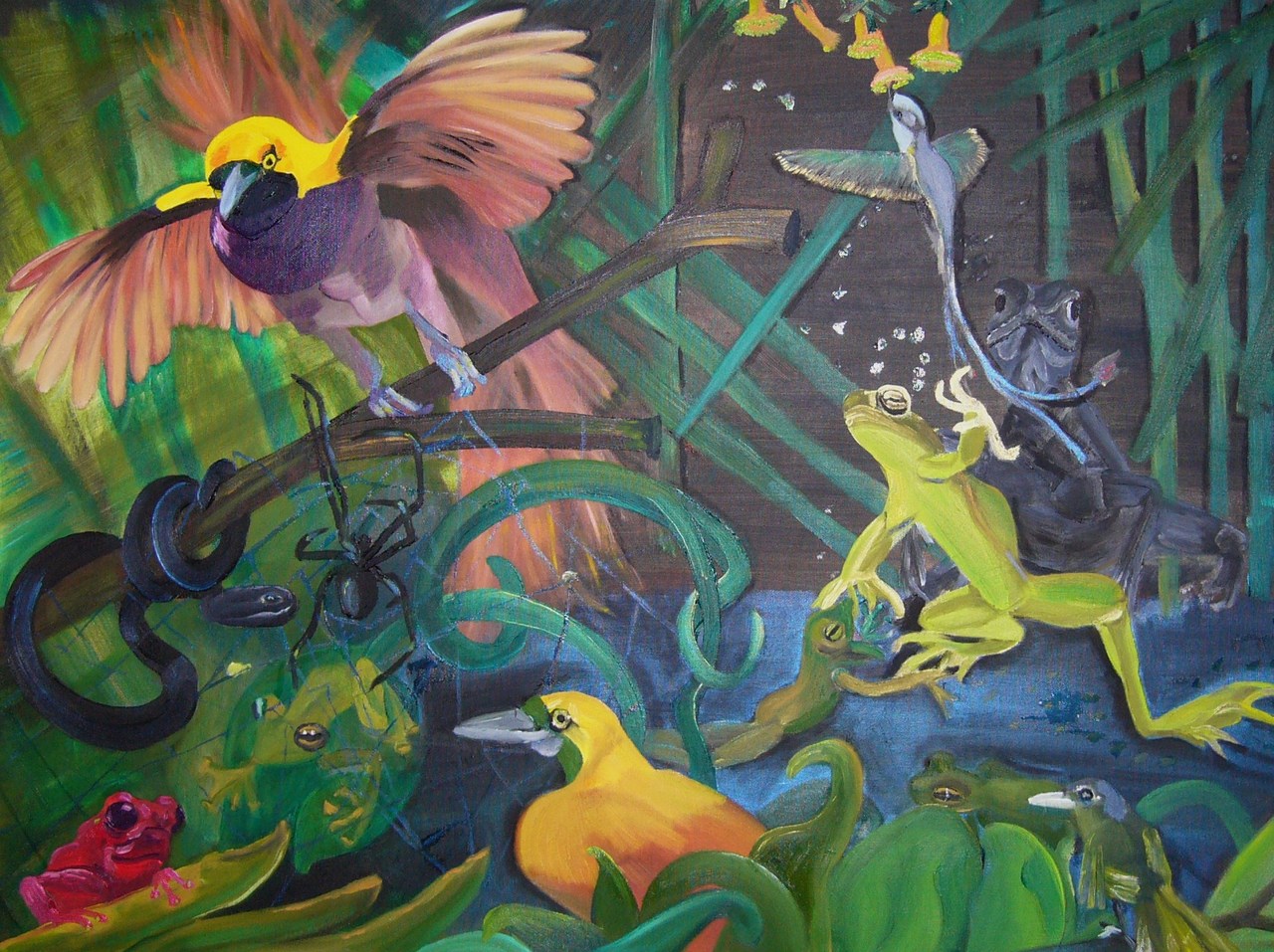 Painted Birds and frogs together, while thinking of Paul Mc'Carthy's song we''ll stand together