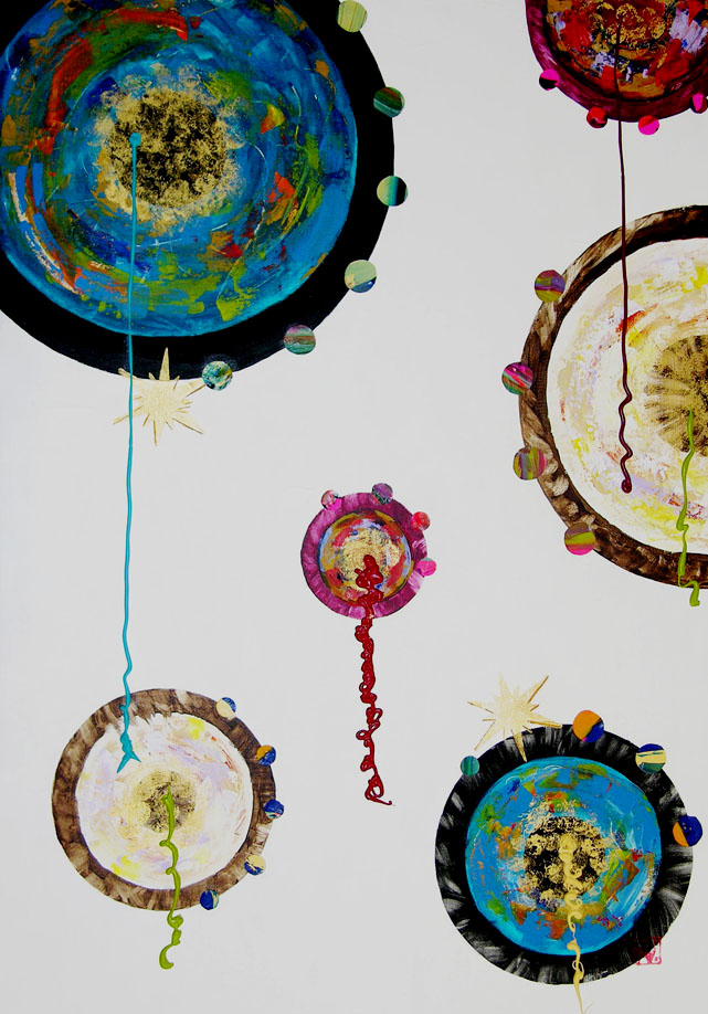 Eenvoud,symboliek en grafische elementen. Etsen, Pastel en Acryl met frisse en kleurrijke voorstellingen.