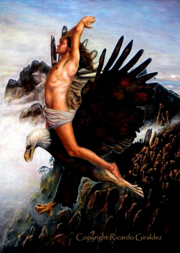 Oil Painting Figurative Symbolist Idealist Man Bellerophon Bird Eagle Wings Flight Chimera Mythology Landscape Mountains Sky Clouds Fog Ricardo Giraldez