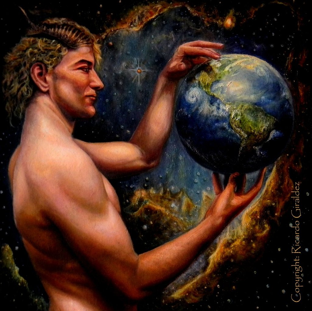 Oil Painting Figurative Symbolism Fantasy Visionary Portrait Profile Face Man Horns Devil Earth Universe Stars Ricardo Giraldez