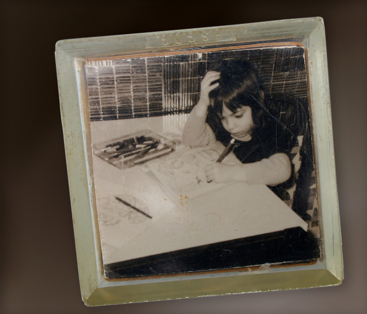 Fotografisch beeld | zijde van fotokubus 4 x 4 cm | herinnering vastgelegd: beeld van een beeld van een beeld