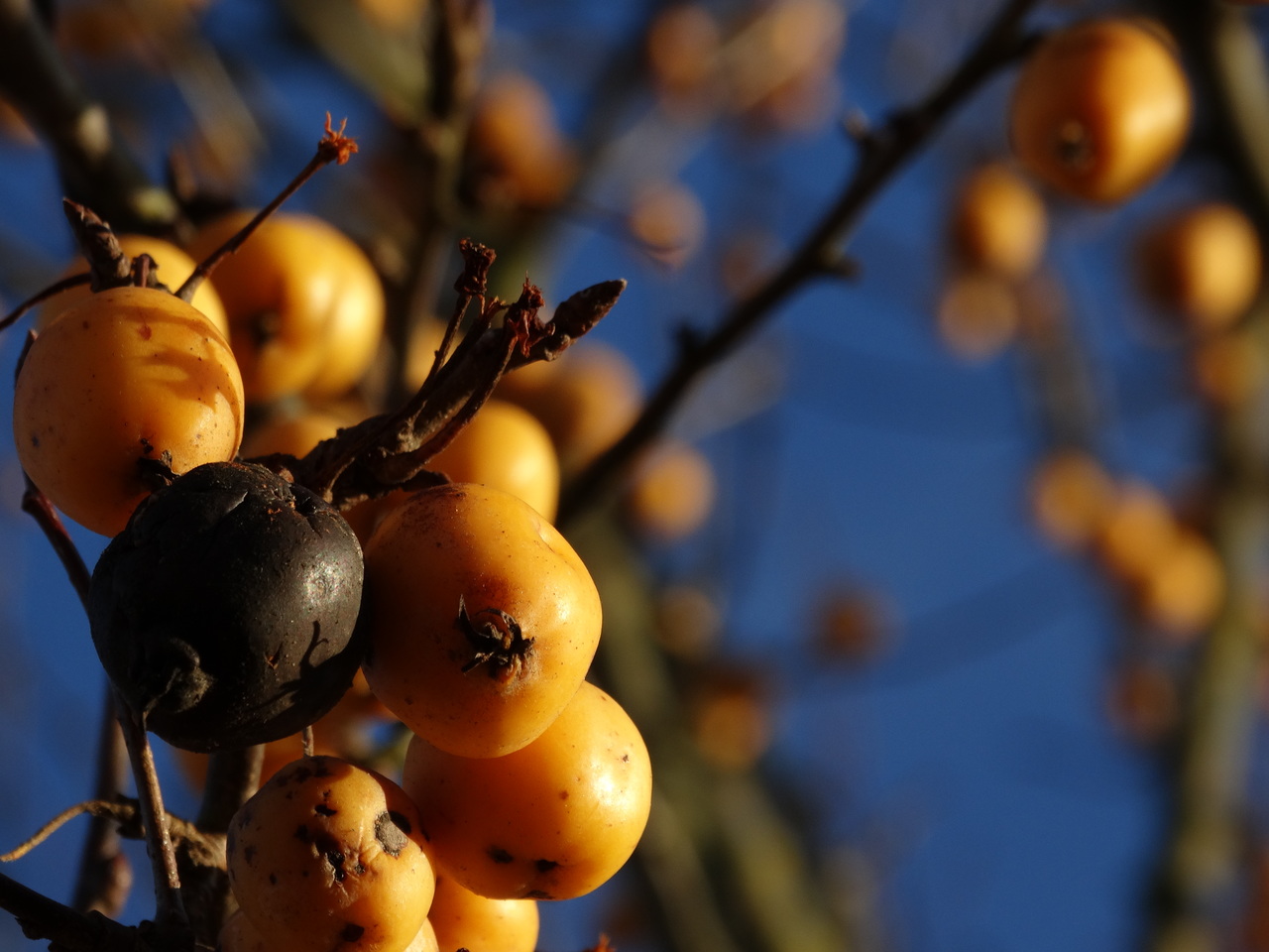Op deze boom (een malus soort) één rotte bes gevonden tussen de gele