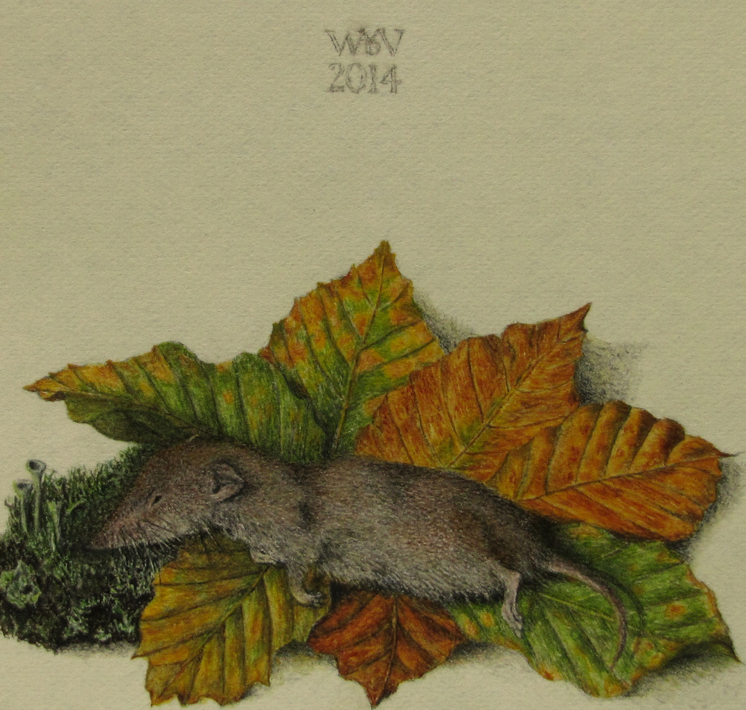 Spitsmuis op beukenblaadjes